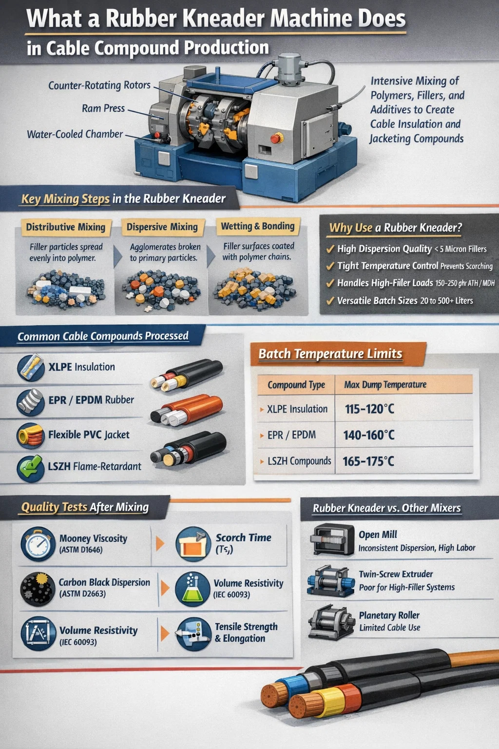 Os fabricantes de cabos trabalham com uma ampla variedade de famílias de compostos de elastômeros elastoméricos e termoplásticos. Cada um impõe demandas diferentes ao equipamento de mistura, e o amassador de borracha lida com todas elas rotineiramente.